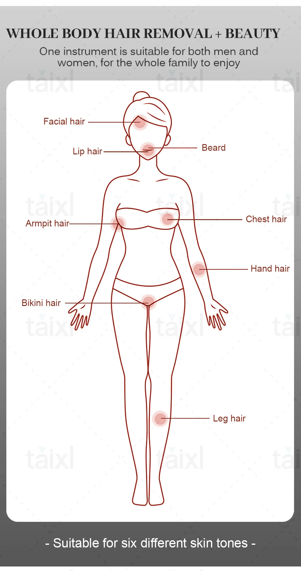 The system optimizes 3 waves in 1 internally, suitable for all skin types. The user interface is simple to operate, just select the corresponding skin color and it will automatically correspond to the corresponding wavelength to achieve the best hair removal effect.