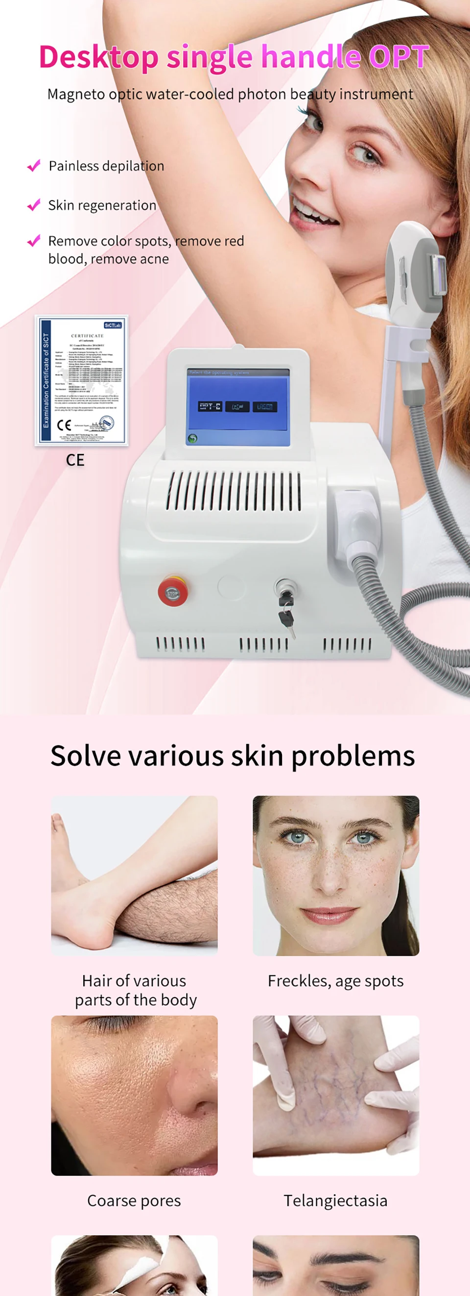 The machine can achieve permanent hair removal. The system combines laser technology and the benefits of the pulsating light method achieving practically painless results. Even hairs which until now have been difficult or even impossible to be removed, can now be treated.