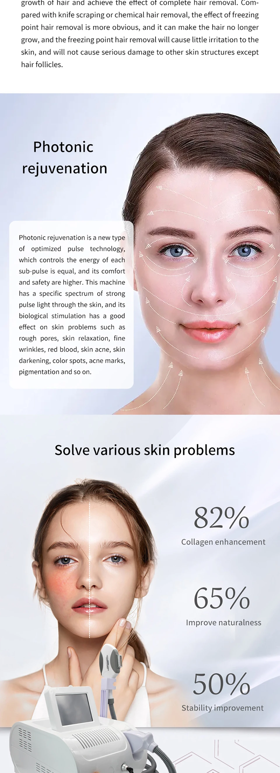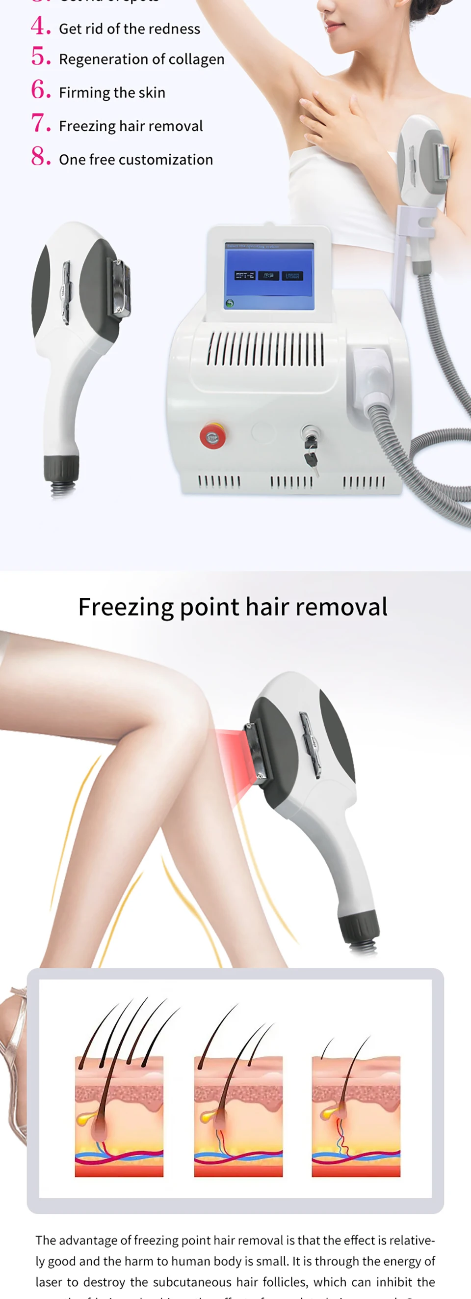 The advantage of freezing point hair removal is that the effect is relative.ly good and the harm to human body is small. It is through the energy oflaser to destroy the subcutaneous hair follicles, which can inhibit thegrowth of hair and achieve the effect of complete hair removal. Com-pared with knife scraping or chemical hair removal, the effect of freezingpoint hair removal is more obwious, and it can make the hair no longergrow, and the freezing point hair removal will cause little irritation to theskin, and will not cause serious damage to other skin structures excepthair follicles.